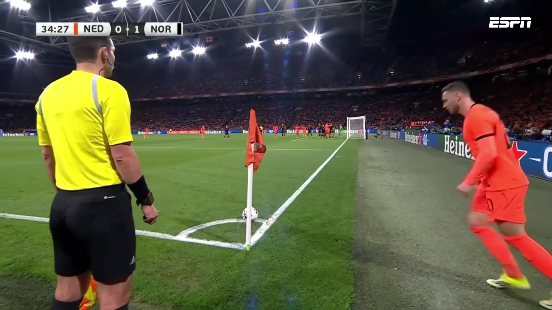 24直播网荷兰1-1扳平比分范戴克高高跃起头球破门库普梅纳斯角球助攻
